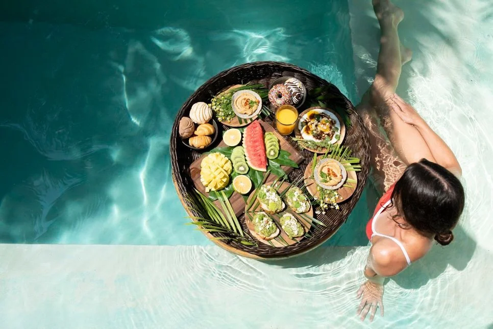 The floating tray drifts across your pool like a quiet gift from the morning, carrying fresh fruit, warm pastries and the bright flavors that suit the slow rhythm of Tulum. We set it up with care so you can wade into the water, reach for breakfast and let the day begin with something simple and beautiful.